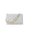 The Pochette Coussin is crafted from soft lambskin, which is embossed with the Monogram pattern to create a puffy, cushiony effect. This is further enhanced by the construction of the pouch, which gives it a supple, body-friendly shape. The removable chain, decorated with a Louis Vuitton charm, offers different carry options: clutch, shoulder or belt.