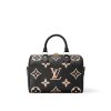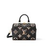 The compact Speedy Bandoulière 25 handbag is made from black Monogram Empreinte leather with the embossed Oversized Monogram pattern in beige. This sophisticated handbag was inspired by the House’s “Express” bag from 1930. Finished with gold-color hardware, the interior is lined in red. A detachable and adjustable shoulder strap, in addition to the top handles, enables carry options.