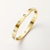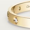 Product Description: LOVE bracelet Yellow gold 750/1000 Set with 10 brilliant-cut diamonds totaling 0.96 carats Width: 6.1 mm Oval bracelet composed of two rigid arcs which is worn on the wrist and removed using a specific screwdriver The closure is designed with two functional screws placed on either side of the bracelet: you will need help to open or close it To determine the size of your LOVE bracelet measure your wrist adding one centimeter to your size for a tighter fit or two centimeters for a looser fit