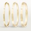 LOVE bracelet, small model, 18K yellow gold (750/1000), fastening system with functional screw and hinge. Comes with a screwdriver. Width 3.65 mm. Created in New York in 1969, the LOVE bracelet is a jewelry design icon: a close fitting, oval bracelet composed of two rigid arcs, which is worn on the wrist and removed using a special screwdriver. Cartier continues the story of the original LOVE bracelet with a slimmer version featuring a hinge. Same design, same story: a timeless – yet slightly slimmer – creation which is fastened using a screwdriver. On this model, the closing system consists of a functional screw on one side of the bracelet and a hinge on the other, enabling it to be put on and taken off by itself with the help of a screwdriver. To determine the size of your LOVE bracelet, measure your wrist, adding one centimeter to your size for a tighter fit, or two centimeters for a looser fit.