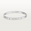Product Description: LOVE bracelet Small model 18K white gold (750/1000) Set with 6 diamonds totaling 0.15 carats Width: 3.65 mm (for size 17) Thickness: 2.05 mm (for size 17) Its oval shape ensures a close but comfortable fit to the wearer’s wrist The locking mechanism consists of a single functional screw on one side of the bracelet and a hinge on the other Each LOVE bracelet is sold with a matching screwdriver specifically created for this piece To discover your recommended LOVE bracelet size please visit our Bracelet Sizing chart Add one centimeter to your size for a tight fit or two centimeters for a looser fit