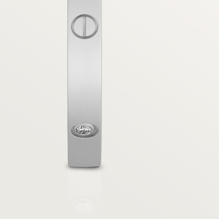 Product Description: LOVE bracelet Small model 18K white gold (750/1000) Set with 6 diamonds totaling 0.15 carats Width: 3.65 mm (for size 17) Thickness: 2.05 mm (for size 17) Its oval shape ensures a close but comfortable fit to the wearer’s wrist The locking mechanism consists of a single functional screw on one side of the bracelet and a hinge on the other Each LOVE bracelet is sold with a matching screwdriver specifically created for this piece To discover your recommended LOVE bracelet size please visit our Bracelet Sizing chart Add one centimeter to your size for a tight fit or two centimeters for a looser fit