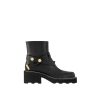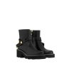 The LV Beaubourg ankle boot in smooth calf leather is notable for its belt detail inspired by the Spring-Summer 2024 show. The belt is secured with Louis Vuitton-engraved studs and finished with an engraved plaque, both in gold-toned metal. This easy-to-wear style comes on a sturdy heel and a chunky yet lightweight micro outsole.