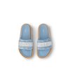 The LV Bliss comfort mule is a casual style distinguished by its wide front strap in faded Monogram denim, which is embellished with a Louis Vuitton ribbon. Natural leather edging around the outsole is a refined detail of this design, which also features a padded insole and a lightweight rubber outsole.