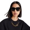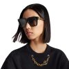 The LV Edge Large Square sunglasses pay tribute to a distinguished House style. The pair offers an updated version of the Spring-Summer 2021 design with thinner temples inspired by the chain links of the Coussin bag. These statement-making glasses are engraved with Monogram motifs on each chain link, highlighting Louis Vuitton’s expert craftsmanship.