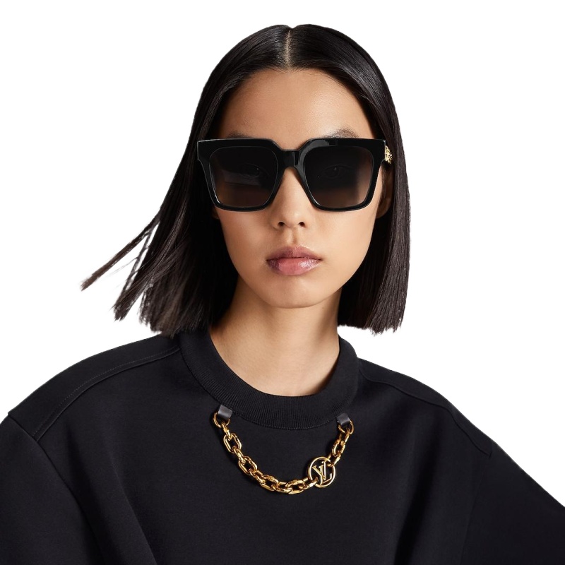 The LV Edge Large Square sunglasses pay tribute to a distinguished House style. The pair offers an updated version of the Spring-Summer 2021 design with thinner temples inspired by the chain links of the Coussin bag. These statement-making glasses are engraved with Monogram motifs on each chain link, highlighting Louis Vuitton's expert craftsmanship.