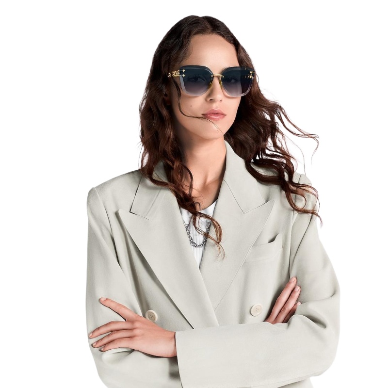 Delicate rimless lenses combine with bold chain-effect temples to give the LV Jewel Cat Eye sunglasses their unique look. Classic House signatures are revealed in subtle details throughout this pair. The iconic LV Initials are incorporated into the chain link design while hand-polished Monogram Flower studs adorn the smoky gradient lenses.