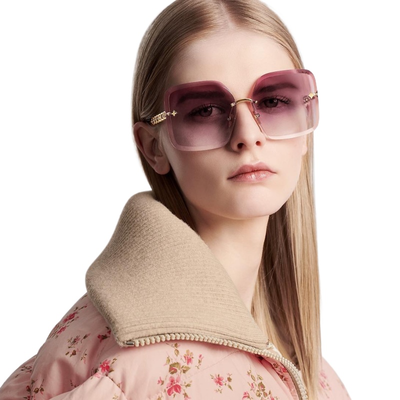 The LV Jewel Square sunglasses offer a precious, colorful signature look. Their on-trend rimless design combines delicately faceted hand-polished lenses with gold-tone metal temples in the form of chain links inset with the LV Initials and Monogram Flowers. With their outsized square shape, they add a tinge of glamour to any summer outfit.