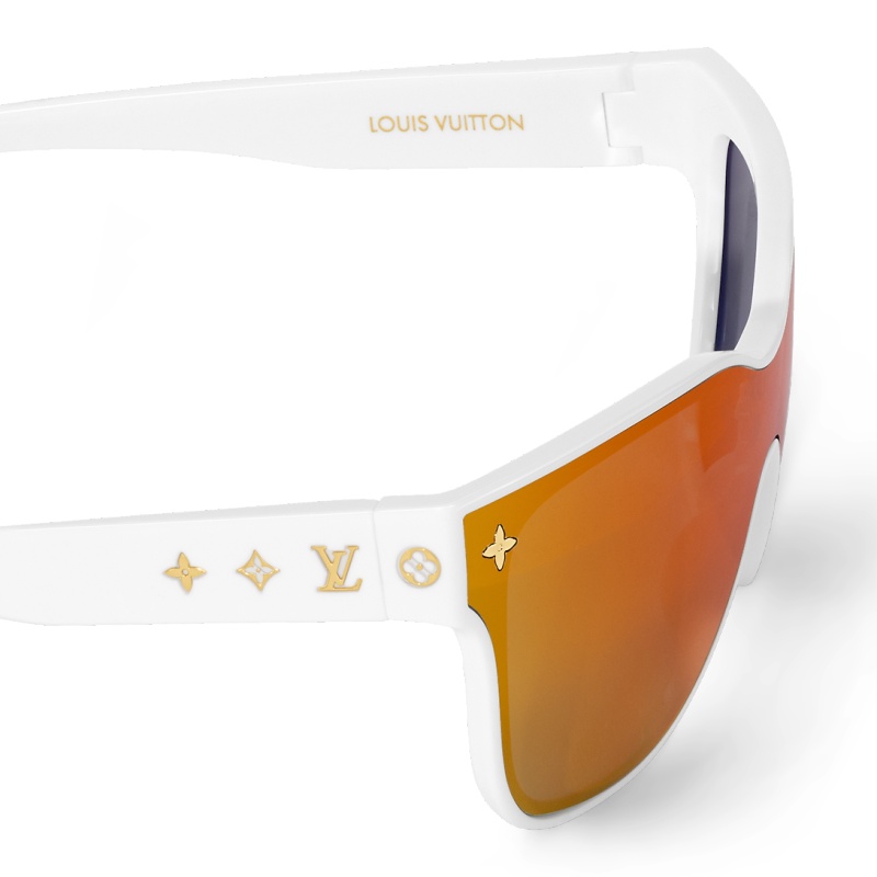 LV Shadow Square sunglasses offer a futuristic look. Reminiscent of the LV Snow ski goggles, the sleek and sporty shape is complemented by a striking mirror lens. Polished Monogram Flowers appear at the end pieces, temples and tips, while a pointed version provides a discreet detail behind the bridge.