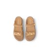 The LV Sunset platform comfort sandal is an easy-to-wear style featuring two adjustable velcro straps in supple, lightly padded lambskin. The straps are embellished with gold-tone studs in the shape of hearts and iconic Louis Vuitton signatures. This model is finished with an on-trend platform outsole in lightweight micro.