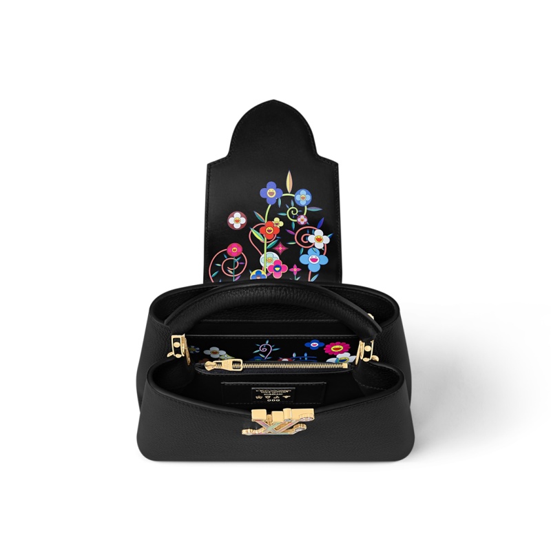 Bold signatures from the second edition of the Louis Vuitton x Murakami collection elevate the House’s iconic Capucines BB handbag into a playful statement. It exudes timeless House codes in Taurillon leather detailed with golden hardware, while the Japanese artist’s superflat style reimagines the emblematic LV Initials on the front and a cluster of Monogram Flowers that feature as a bag charm.