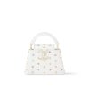 The joyful rainbow palette of Japanese artist Takashi Murakami uplifts this chic Capucines Mini with a fresh signature finish. It is crafted in playful proportions from Taurillon leather, which is embellished with a multicolored Monogram motif in metallic studs, while the soft pink cowhide lining strikes a subtle contrast inside. A removable braided strap offers versatile carry options, and the compartmented interior organizes daily essentials such as a smartphone and a compact wallet.