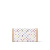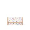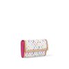 The Sarah wallet pays homage to the House’s heritage travel trunks in an understated lateral shape trimmed with natural cowhide edges and riveted gold-toned corners on the front flap. It is crafted from Monogram coated canvas in a playful rainbow colorway from the re-edition of the Louis Vuitton x Murakami collection. The inside contains two large compartments, multiple pockets and 16 card slots.