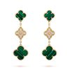 Magic Alhambra earrings, 3 motifs, 18K yellow gold, malachite, round diamonds; diamond quality DEF, IF to VVS.