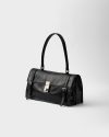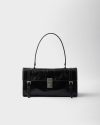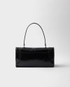 Inspired by rigid and formal work bags, this leather bag with a delicate glossy finish reinterprets classic office silhouettes with a new attitude. The archetypal shape is softened and enriched with sophisticated, feminine details. The vertical clasp, taken from the archives, embellishes the accessory characterized by a long handle that can also be worn over the shoulder.