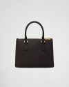 Production of the Prada Galleria bag, composed of 83 pieces, is an authentic fusion between industrial precision and the refined accuracy of craftsmanship that can only be performed by hand. The design is clean and elegant yet innately pragmatic, an aesthetic language blending form and function that combines history and modernity. Originating the definition of "timeless", the Galleria bag has become a hallmark of Prada's identity in the twenty-first century. The accessory, presented in the medium version, is made of iconic Saffiano, a calf leather patented by Mario Prada that is resistant to scratches and water and defined by its crosshatch texture.