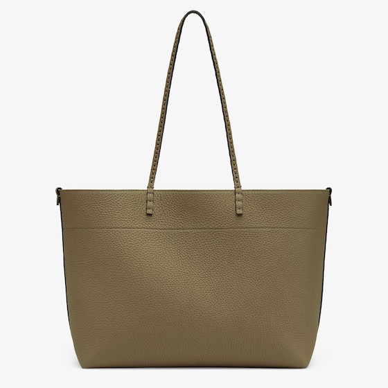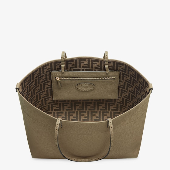 Medium shopper bag, created in 1997 together with the Baguette and designed to partner it. A functional, timeless carry-all, it is the perfect combination of practicality and refined details. Made with 218 hand-sewn tone-on-tone macro topstitches, an emblem of the iconic Selleria workmanship handed down through generations of Fendi artisans since 1925. Made of green Cuoio Romano leather, calfskin with a characteristic natural grain produced with a metal-free tanning process. Featuring an interior compartment lined in jacquard fabric with the iconic brown FF motif, a Cuoio Romano leather internal zipper pocket with leather Selleria stamp and gold-finish metalware. It can be carried by hand or worn on the shoulder thanks to the Cuoio Romano leather handles embellished with macro hand stitching.