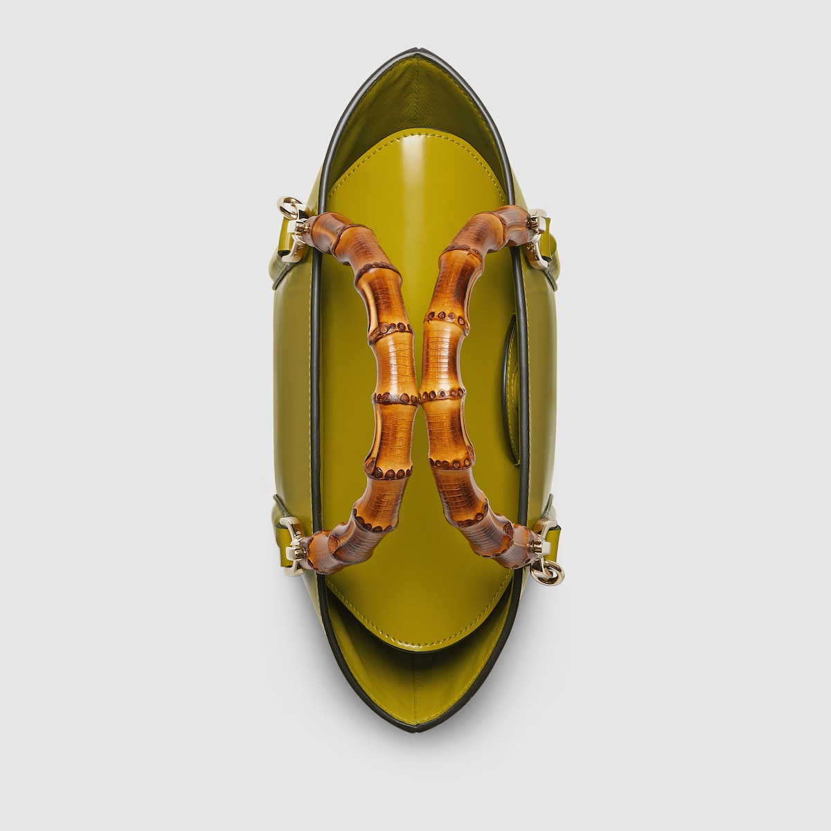 Introducing a bamboo top handle bag, this style from the women’s Fall Winter 2024 runway blends the House’s expert craftsmanship with its iconic motif. The basket-shaped bag reveals a hexagonal base, highlighting its artisanal construction. The mini size in pistacchio green is complete with a detachable shoulder strap.