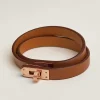 Swift calfskin double bracelet with mini Kelly lock. Made in France. Metal: Rose gold plated Wrist circumference: 14.5 to 15.5 cm | Leather width: 1 cm