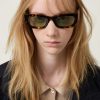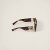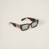 These rectangular acetate sunglasses with a bold design interpret rebellious femininity. The distinctive low profile frame front is accented with the new Miu Miu vertical logo integrated in the hinge of the thick temples.