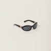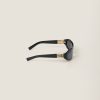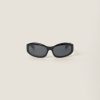 Miu Glimpse sunglasses are reinterpreted in a bold new contemporary version. The acetate frame is characterized by its curved silhouette and bold rims, while the iconic vertical Miu Miu logo is integrated in the temple hinges.
