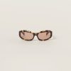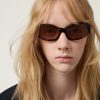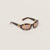 Miu Glimpse sunglasses are reinterpreted in a new bold and contemporary version. The acetate frame is characterized by the curved front and thick rims, while the iconic vertical Miu Miu logo is integrated into the temple hinge.