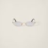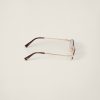 Classic and sophisticated attitudes blend together in these Miu Miu sunglasses. The ultra-light metal frame features rimless oval lenses enriched by a palette of playful shades. The vertical Miu Miu logo decorates the ultra-thin temples.