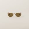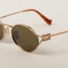 Metal sunglasses with sophisticated allure. The frame is emphasized by thin metal rims that separate from the trendy oval lenses before meeting up again to create the new vertical Miu Miu logo integrated into the hinge of the straight temples.
