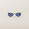 Metal sunglasses with sophisticated allure. The frame is emphasized by thin metal rims that separate from the trendy oval lenses before meeting up again to create the new vertical Miu Miu logo integrated into the hinge of the straight temples.