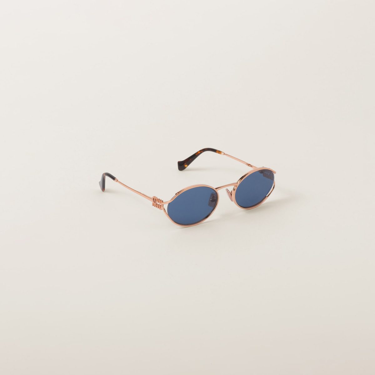 Metal sunglasses with sophisticated allure. The frame is emphasized by thin metal rims that separate from the trendy oval lenses before meeting up again to create the new vertical Miu Miu logo integrated into the hinge of the straight temples.