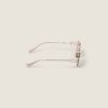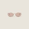 Metal sunglasses with sophisticated allure. The frame is emphasized by thin metal rims that separate from the trendy oval lenses before meeting up again with the new vertical Miu Miu logo integrated into the hinge of the straight temples.