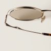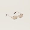Metal sunglasses with sophisticated allure. The frame is emphasized by thin metal rims that separate from the trendy oval lenses before meeting up again with the new vertical Miu Miu logo integrated into the hinge of the straight temples.