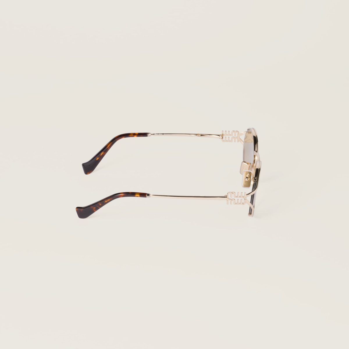 Metal sunglasses with sophisticated allure. The frame is emphasized by thin metal rims that separate from the trendy oval lenses before meeting up again with the new vertical Miu Miu logo integrated into the hinge of the straight temples.