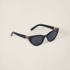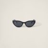 Acetate sunglasses characterized by a cat-eye silhouette. The oversized frame expresses contemporary femininity, while the straight temples are enriched with the iconic note of the Miu Miu vertical logo.