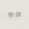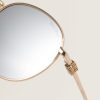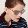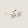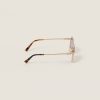 Metal sunglasses with contemporary allure. The frame is emphasized by the slim metal rims that highlight the classic round design with a modern look. The vertical Miu Miu logo is integrated into the hinge of the straight temples.