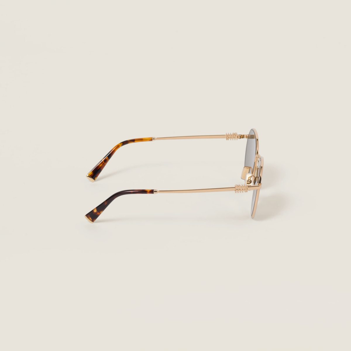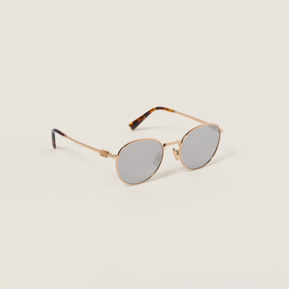 Metal sunglasses with contemporary allure. The frame is emphasized by the slim metal rims that highlight the classic round design with a modern look. The vertical Miu Miu logo is integrated into the hinge of the straight temples.