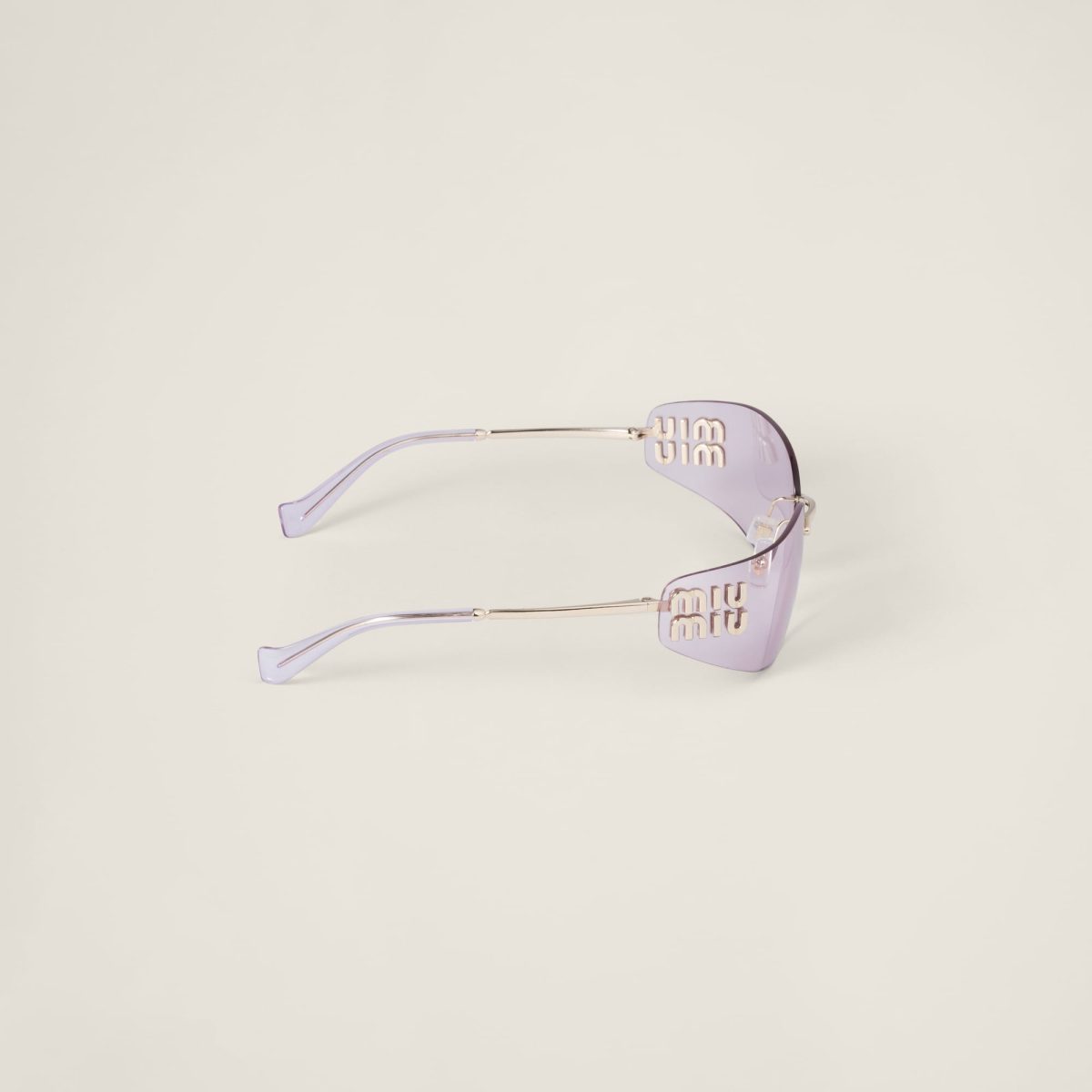 Metal sunglasses with a refined, contemporary design. The ultra-light frame features rimless, curved lenses enhanced by the imposing Miu Miu vertical logo.