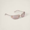 Metal sunglasses with a refined, contemporary design. The ultra-light frame features rimless, curved lenses enhanced by the imposing Miu Miu vertical logo.