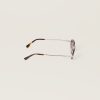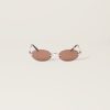 Classic and sophisticated attitudes blend in these Miu Miu sunglasses. The ultra-light metal frame features rimless oval lenses enriched by a palette of playful shades. The vertical Miu Miu logo decorates the ultra-thin temples.