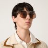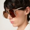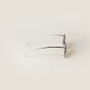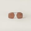 Sinuous lines and refined details define these Miu Ombre sunglasses for Spring/Summer 2025. The oversized metal frame has square lenses highlighted by the strong design of the double bridge. The temples are decorated with the Miu Miu logo in a contrasting gold or silver finish.