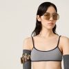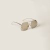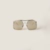 Sinuous lines and refined details define these Miu Ombre sunglasses for Spring/Summer 2025. The oversized metal frame has square lenses highlighted by the strong design of the double bridge. The temples are decorated with the Miu Miu logo in a contrasting gold or silver finish.