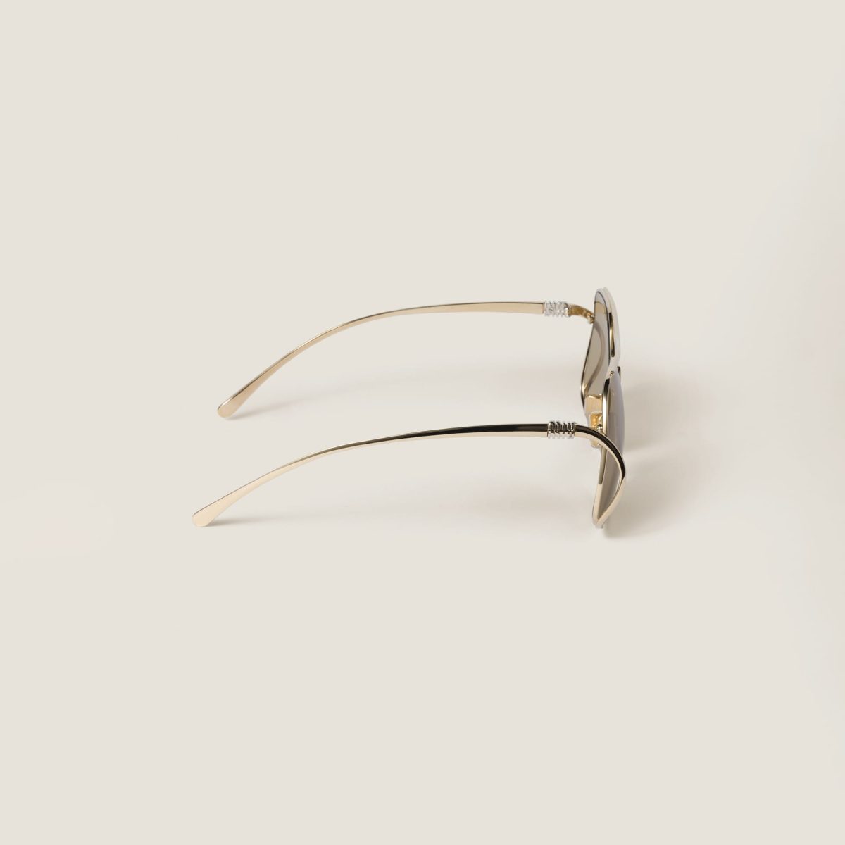Sinuous lines and refined details define these Miu Ombre sunglasses for Spring/Summer 2025. The oversized metal frame has square lenses highlighted by the strong design of the double bridge. The temples are decorated with the Miu Miu logo in a contrasting gold or silver finish.