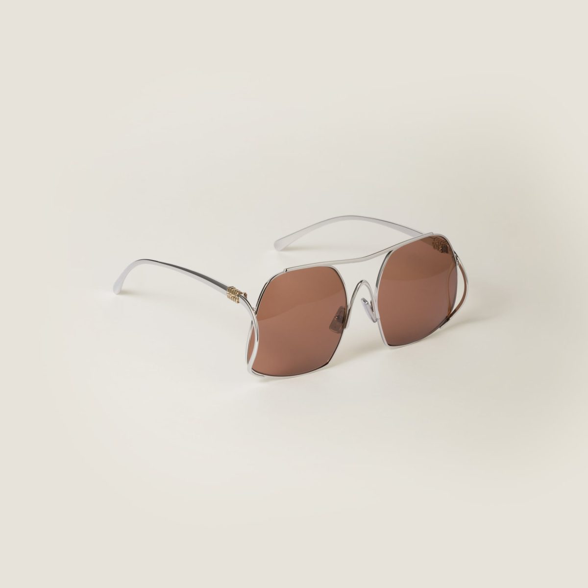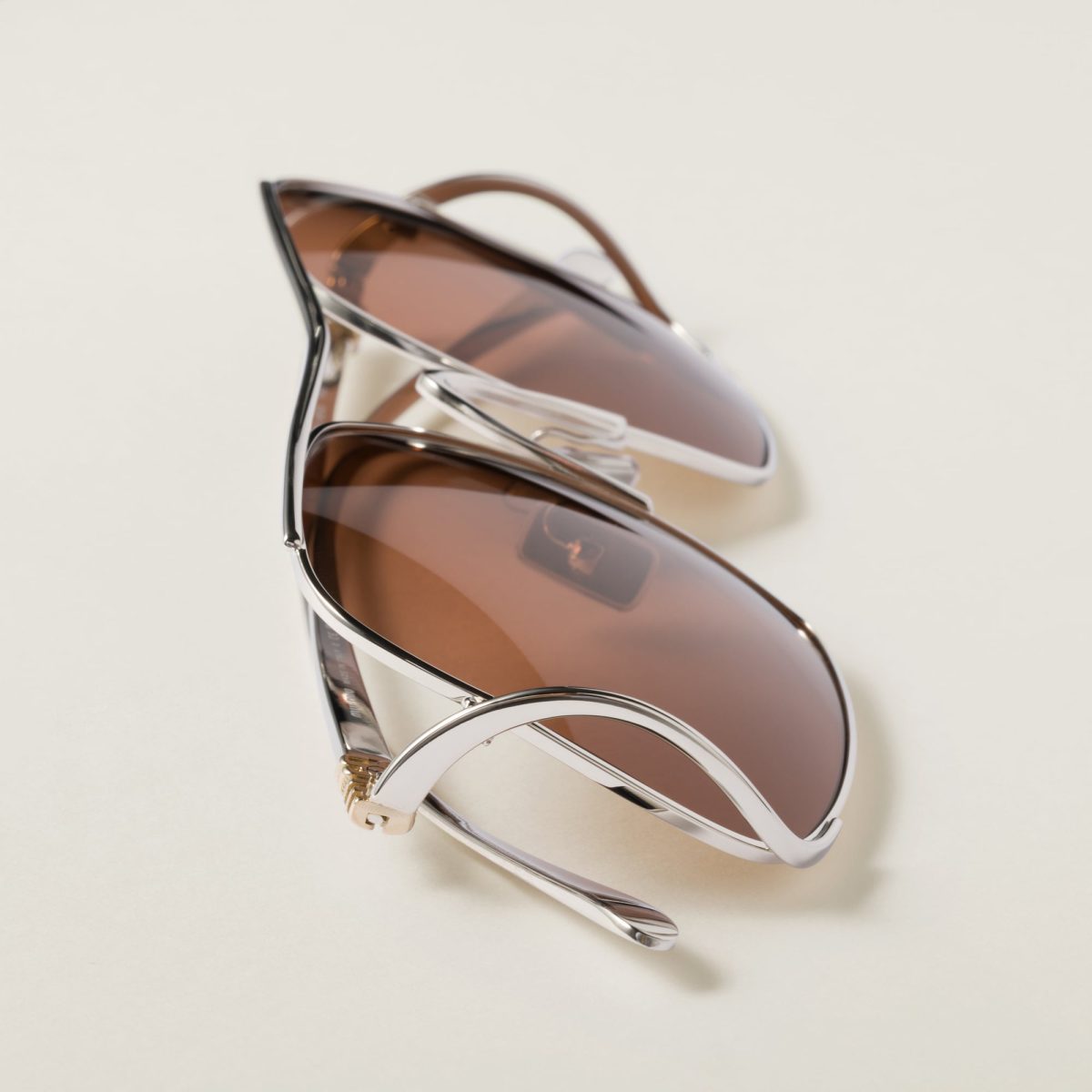 Sinuous lines and refined details define these Miu Ombre sunglasses for Spring/Summer 2025. The oversized metal frame has square lenses highlighted by the strong design of the double bridge. The temples are decorated with the Miu Miu logo in a contrasting gold or silver finish.