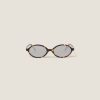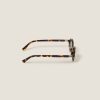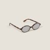 Acetate sunglasses with a sophisticated oval shape. The acetate frame has thin rims and ultra-flat lenses that highlight the extreme lightness. The vertical Miu Miu logo embellishes the temples with a refined touch.