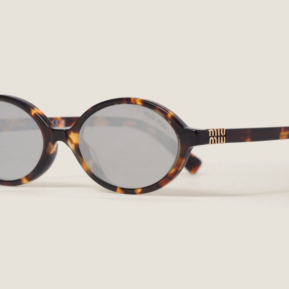 Acetate sunglasses with a sophisticated oval shape. The acetate frame has thin rims and ultra-flat lenses that highlight the extreme lightness. The vertical Miu Miu logo embellishes the temples with a refined touch.
