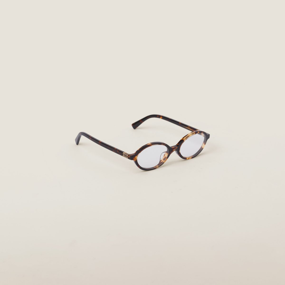 Acetate sunglasses with a sophisticated oval shape. The acetate frame has thin rims and ultra-flat lenses that highlight the extreme lightness. The vertical Miu Miu logo embellishes the temples with a refined touch.