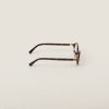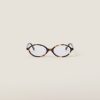 Acetate sunglasses with a sophisticated oval shape. The acetate frame has thin rims and ultra-flat lenses that highlight the extreme lightness. The vertical Miu Miu logo embellishes the temples with a refined touch.