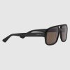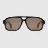 Gucci continues to reimagine everyday accessories in new ways. These sunglasses are characterized by a black injected frame, and the temples are further enhanced by the House’s logo script. Dark brown lenses complete the design.