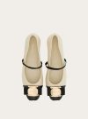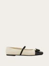 Inspired by a classic, this contemporary ballet flat features a super soft bicolor leather upper with ruffles at the pointed tip just like their namesake. The gros grain elastic across the upper duets with Vara bow held by the new Ferragamo buckle at the toe. Knurled rubber flexible sole.