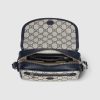 Guccio Gucci’s everlasting monogram continues to enrich new designs with a logo feel. This Ophidia mini shoulder bag is presented in a beige and blue variation of the historical GG Supreme canvas, complete with the Web stripe.